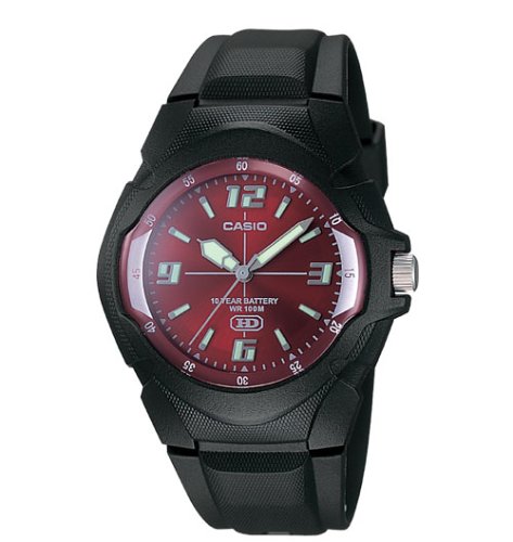 A luminous red dial and silver-tone luminous hands lend this Casio Watch #MW600E-4AV its sporty edge. White numbers and indexes on an outer dial, and a sturdy black resin band deliver an eye-catching, stripped-down look that's ideal for everyday wear. Boasting the reliability and precision of quartz movement, and the added protection of a mineral crystal, this durable timepiece has a 10-year battery for longterm wear. The timepiece is water resistant to 165 feet. Read more...