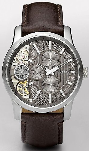 We cut out a section of the dial to expose its inner workings and gears. Textured taupe with silver indexes complements the genuine brown leather strap. From timeless classics to the latest fashions, Fossil is sure to have the timepiece that perfectly compliments your unique sense of style. Founded in 1984 when timepieces were created more for function than fashion, Fossil began to transform this notion with its unique combination of vintage 1950s Americana design and affordably accessible cool style. Adding to their collectability were the one-of-a-kind, trademark tins that came with the watches that mixed a creative spirit with a sense of humor. These iconic boxes are nearly as popular as the watches they hold and are regularly collected and traded throughout the world at flea markets, antique shops, and on eBay.