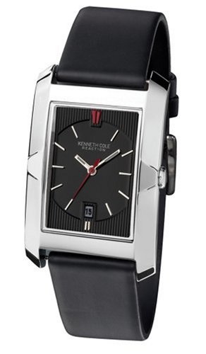 Urbanely refined, this Kenneth Cole Reaction stainless steel men's watch is a great choice for a stylish everyday timepiece. Manufactured using the highest quality materials and craftsmanship, Kenneth Cole blends both traditional and forward thinking design philosophies to create a unique, modern timepiece. It features a tall, rectangular watch case with triangle-shaped accents on the sides. The black face features a smooth-surfaced inner dial framed by texturing. It also includes thin stick hour markers, a red double-stick marker at 12 o'clock, small luminous-tipped baton hands (with red seconds hand), and a date window at 6 o'clock. Other features include a scratch-resistant mineral crystal and water resistance to 30 meters (99 feet)--enabling it to withstand splashes, rain and snow, but not suitable for swimming.