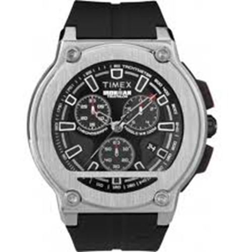 This sporty timepiece by Timex for men offers a stainless steel case and black rubber strap. The watch features a black and black chronograph dial, a date display, quartz movement and a water resistance level of up to 100 meters. Read more...