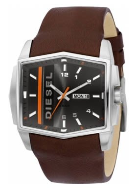 Casual watch, Japanese quartz movement, Polished silver-tone hands with luminous accents and orange sweep seconds, Applied brushed silver-tone Arabic numbers mark from twelve to six o'clock, Applied luminescent polished silver-tone baton markers, Orange Arabic numbers and black indices mark surrounding minute track, Dual-panel analog day-and-date aperture at three o'clock, Brushed gunmetal-tone dial with orange detailing and raised logo, Brown distressed genuine leather strap with brushed silver-tone stainless steel buckle, Polished silver-tone stainless steel hexagonal case, Textured steel crown with logo, Stainless steel caseback, Mineral crystal, 50 meters/165 feet water resistant Read more...