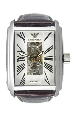 Stainless steel case with a brown leather strap. Fixed bezel. Silver skeletal dial with luminous hands and Roman numeral hour markers. Automatic movement. Scratch resistant mineral crystal. Case diameter: 40 mm. Case thickness: 14 mm. Tang clasp. Water resistant at 30 meters/ 100 feet. Functions: hours, minutes, seconds. Emporio Armani Meccanico Mens Watch AR4225. Read more...