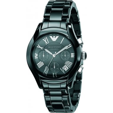 Emporio Armani gives a stylish edge to traditional design with this sleek watch. High-lacquer black ceramic bracelet and round case. Black chronograph dial features logo, silver tone Roman numerals, date window and three sub dials. Quartz chronograph movement. Water resistant to 30 meters. Three-year limited warranty. Read more...
