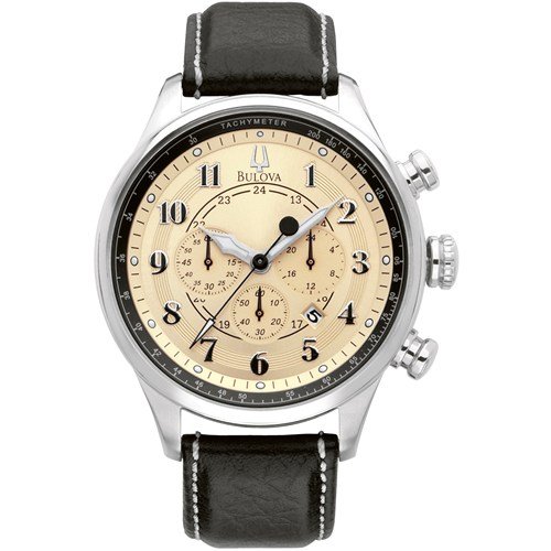 This Bulova watch has a stainless steel case with a black leather bracelet and contrast stiching with a hook-buckle clasp. There is a fixed stainless steel bezel with a fluted steel crown. The dial is light brown in color with silver-tone hands for accent and numeral hour markers in Japanese Quartz movement. The minute markers are located around the outer rim. This Bulova watch as a date display located at the 6 o'clock hour. This model is a chronograph with three sub-dials displaying 60 seconds, 60 minutes, and 24 hours, and is water resistant up to 50 meters/165 feet. Bulova Adventurer Chronograph Mens Watch 96B137. Read more...