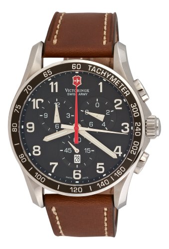 The Victorinox Swiss Army Men's Chrono Classic XL Watch #V251198 showcases traditional chronograph style blended with rugged technical details. At the center of this look is a black dial featuring white Arabic numeral indexes, a date window at six o'clock, and the distinctive red Victorinox Swiss Army shield at 12 o'clock. The stainless steel bezel is finished in black with distinctive white tachymeter markings, which can be used in conjunction with the watch's four hands to help you convert elapsed time to units per hour for tracking distance, speed, or productivity. This classic watch also features a 45-millimeter stainless steel case, a textured crown, and a scratch-resistant sapphire crystal with an anti-reflective finish that protects the watch face and helps ensure easy-reference. A brown leather band with white accent stitching and a buckle clasp hold this timepiece in place. It is powered by precise, Swiss-quartz movement and is water resistant to 330 feet (100 meters). Read more...